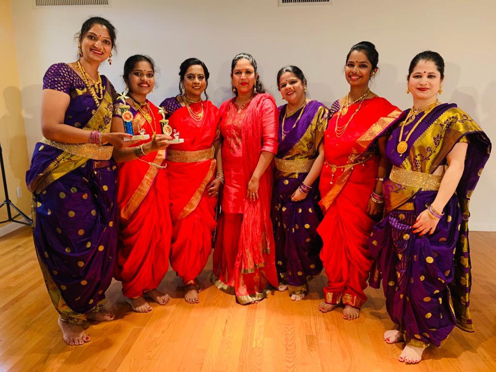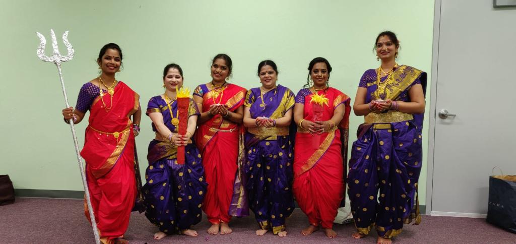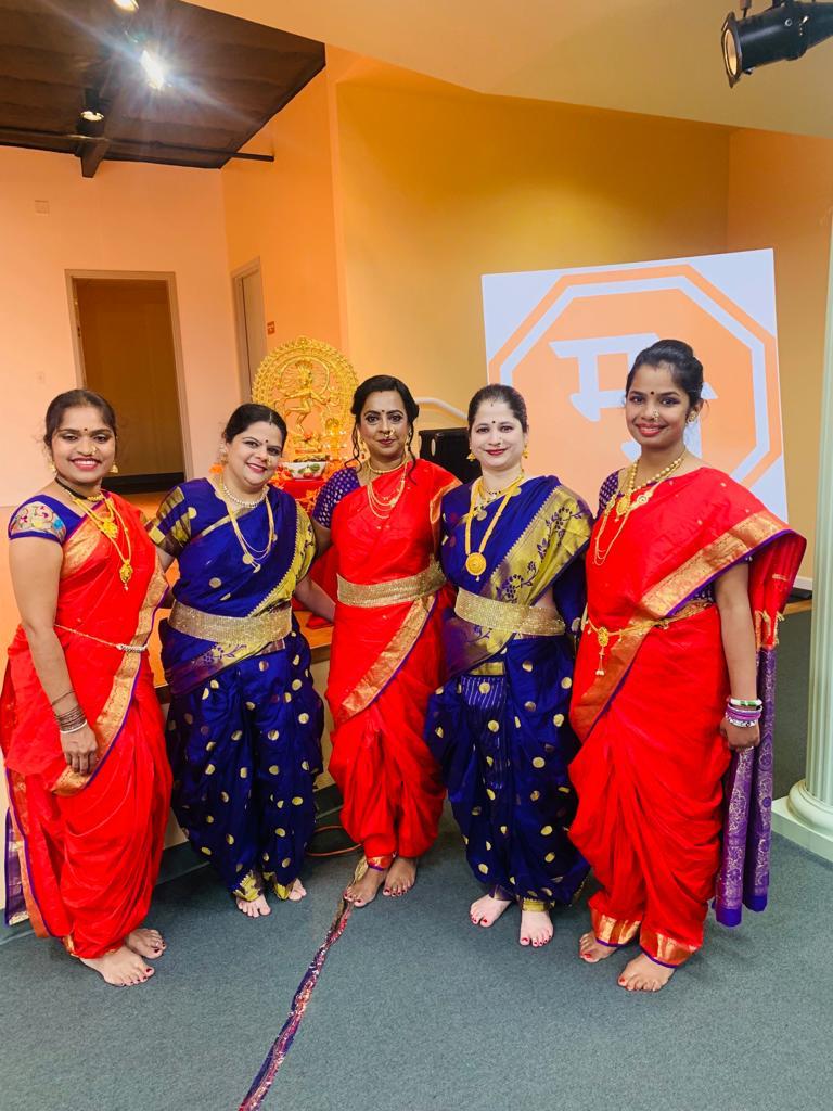 Be the epitome of grace in this royal blue, purple, and golden Pinga Lavni nauvari saree set! This beautiful outfit features a stunning blue and purple nauvari saree with shimmering golden embellishments. The set comes with a matching golden necklace, kamar patti, payal, and jhumka, making it a complete showstopper.