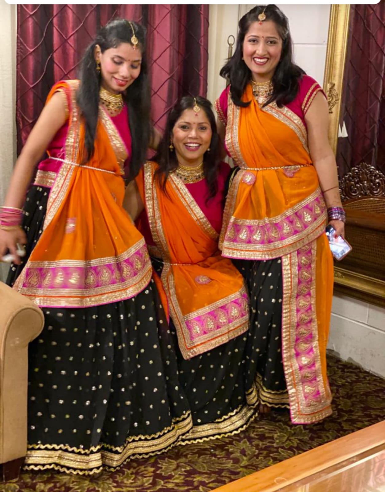 Complete your Bollywood dance look with this vibrant Orange Chunni Duppata Royal Pink Lehenga Maang Tika set. The set includes a flowing orange chunni dupatta, a stunning royal pink lehenga, and a beautiful maang tika headpiece. The lehenga may be adorned with intricate details (details will vary based on specific inventory). This outfit is perfect for making a grand entrance on stage or at any special event.